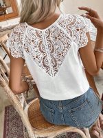 Composición: 100% Algodón. Este top blanco de estilo casual está confeccionado en tela tricotada semitransparente con un nivel de estiramiento medio, ofreciendo suavidad y confort. Presenta escote en “V” y mangas raglán cortas que aportan un toque relajado y favorecedor. El detalle de encaje en contraste le añade un aire delicado y femenino, ideal para un look fresco y natural. Su corte normal y ajuste regular permiten una caída ligera, perfecta para climas cálidos o salidas informales. Puede lavarse en máquina o realizar limpieza en seco profesional para mantener su forma y textura.