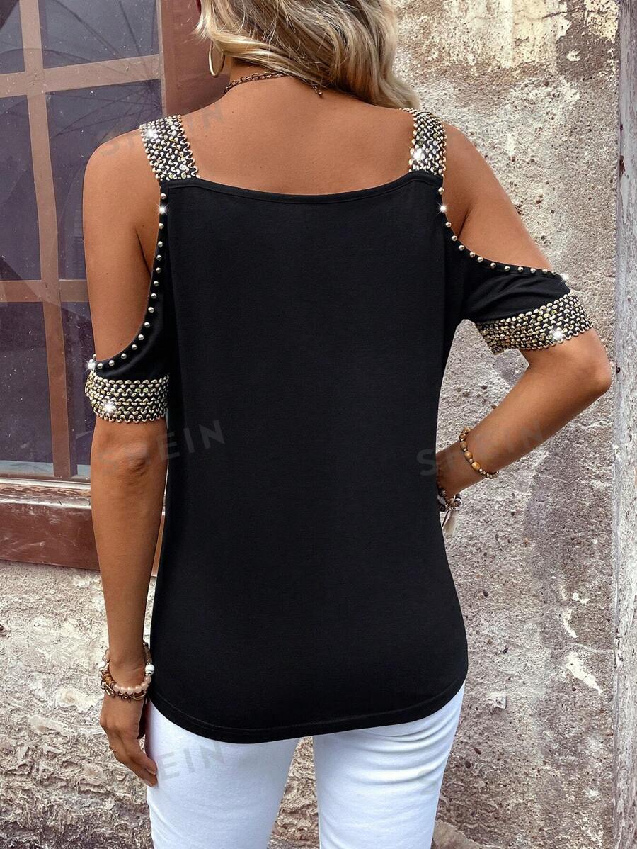 Composición: 95% polipropileno, 5% elastano. Esta blusa off-shoulder en negro es una opción chic y casual, perfecta para cualquier ocasión. Con su escote en V y adornos de cuentas, esta pieza te hará lucir elegante y a la moda. ¡No te la puedes perder!