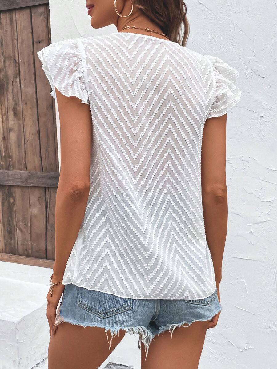 Composición: 100% Soft Poliéster (símil algodón). Este top blanco de estilo casual destaca por su diseño femenino y delicado. Confeccionado en tela tejida no elástica y sin forro, presenta un corte normal con escote en “V” o pico y mangas capa con volantes que aportan movimiento y suavidad. Los detalles de bordado de ojal y volantes añaden un toque artesanal encantador, ideal para looks frescos y naturales. De ajuste regular, resulta cómodo y versátil para combinar con faldas o jeans. Se puede lavar a máquina o limpiar en seco profesionalmente, manteniendo su textura y forma original.