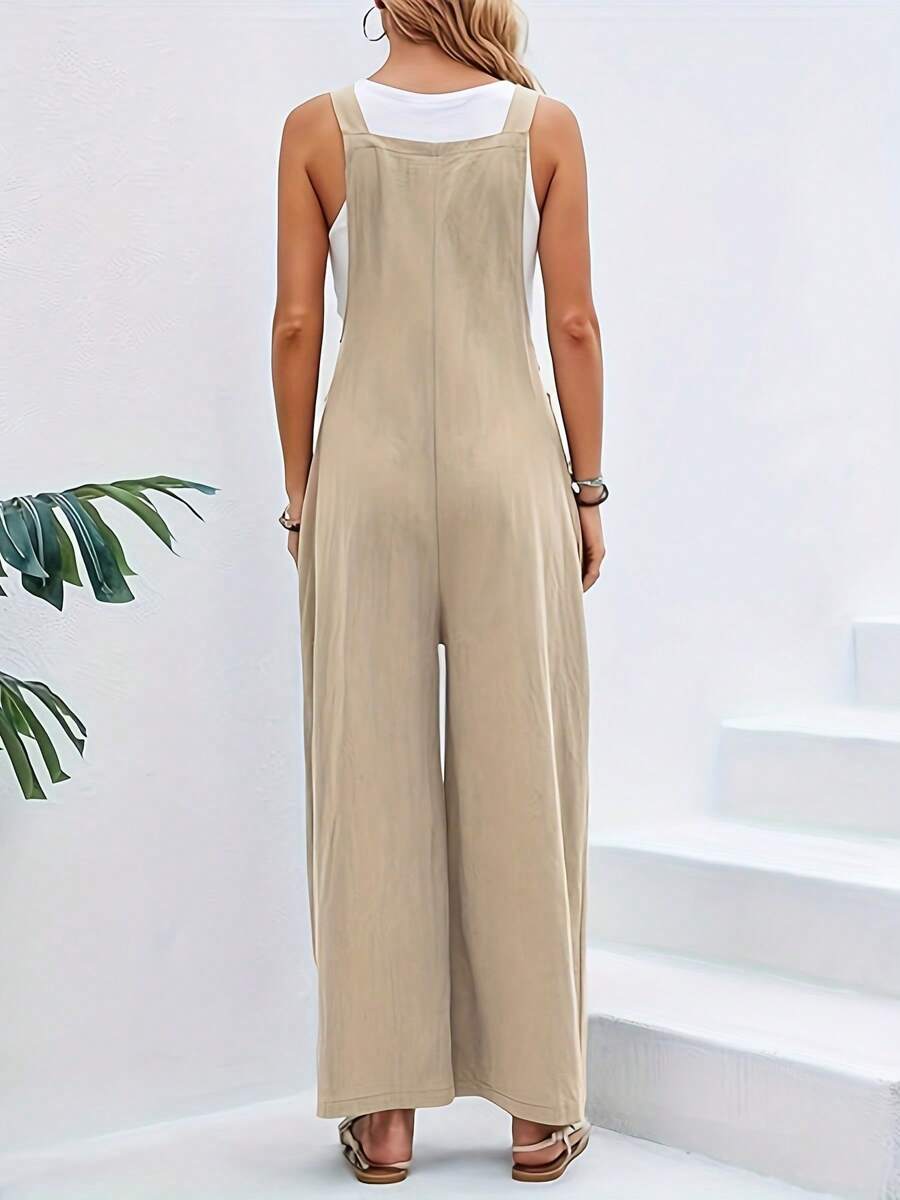Composición: Soft Poliéster (símil algodón). Este mono beige es la combinación perfecta de comodidad y estilo. Con tirantas ajustadas, un diseño de pierna ancha y prácticos bolsillos, es ideal para un look casual y dulce. Su tela elástica y suave asegura un ajuste cómodo que se adapta a tu figura. El color caqui sólido lo hace fácil de combinar con cualquier accesorio.