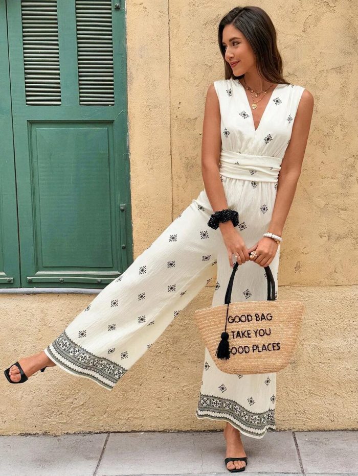Composición: 80% Viscosa, 20% Poliamida. Este vestido extralargo de corte suelto resalta con su talle alto y un favorecedor escote en “V” o pico. Está confeccionado en tela tejida sin forro, no elástica y de acabado ligero, lo que aporta frescura y movimiento. Presenta un diseño envolvente con espalda descubierta y delicado botón delantero, además de un estampado geométrico con motivos de plantas en tonos multicolor suaves que evocan armonía. Su estilo moderno y elegante se combina con un diseño sin mangas que realza la silueta de manera natural. Para su cuidado, se recomienda lavado a máquina o limpieza en seco profesional.