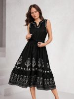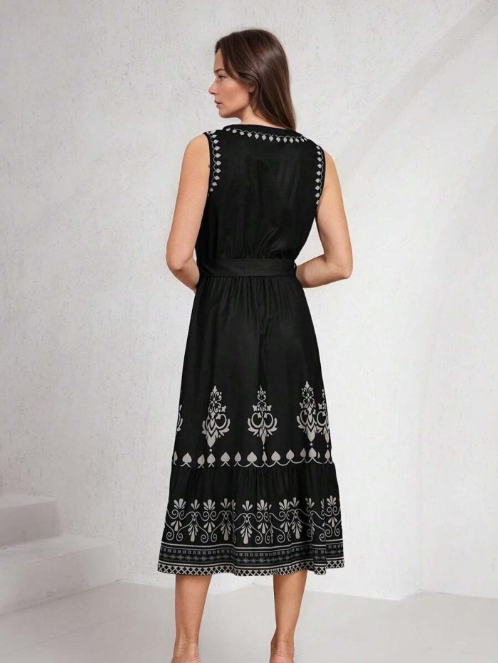 Composición: 100% Soft Poliéster (símil algodón). Este vestido midi de corte en “A” destaca por su talle alto y escote en “V” que estiliza la silueta con elegancia. Confeccionado en tela tejida no elástica y sin forro, ofrece ligereza y frescura. Sus detalles incluyen cinturón que realza la cintura, botones decorativos y un bajo con volantes que aportan movimiento y feminidad. El color negro profundo, combinado con un delicado estampado de plantas, lo convierte en una pieza sofisticada y versátil. Para su cuidado, se recomienda lavado a máquina con detergente suave, evitando la limpieza en seco.