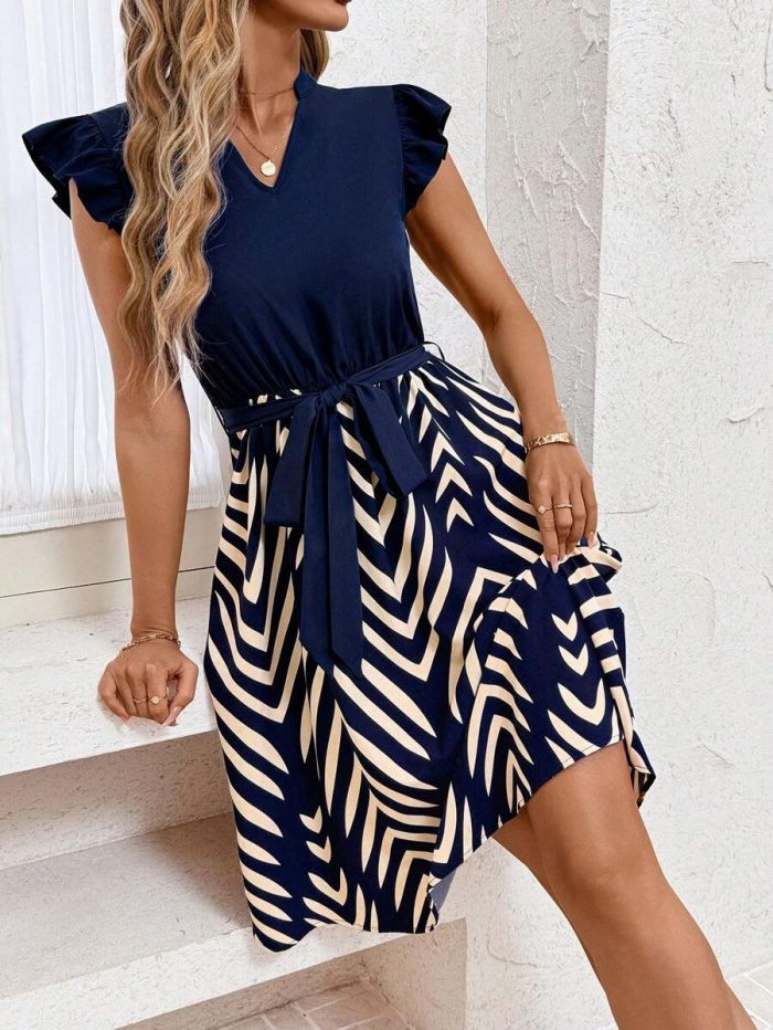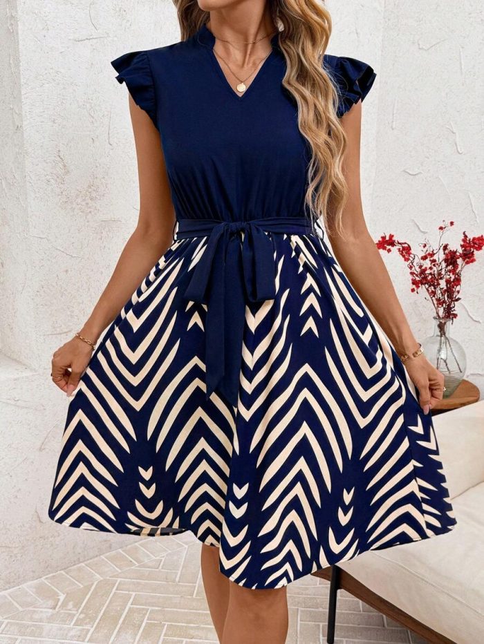 Composición: 95% Soft Poliéster (símil algodón), 5% Elastano. Este vestido de línea A presenta un talle alto con escote en “V” y un corte campana que aporta movimiento y elegancia. Confeccionado en un profundo tono azul marino, destaca por su estampado geométrico y mangas capa con volantes que añaden un aire moderno y delicado. Incluye detalles como cinturón y volantes que realzan la silueta de forma sutil y femenina. Elaborado en tela tejida sin elasticidad visible pero con un ajuste regular, combina comodidad y estructura. Su cuidado es sencillo, recomendado lavado a máquina y evitando la limpieza en seco para preservar su textura y color.