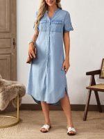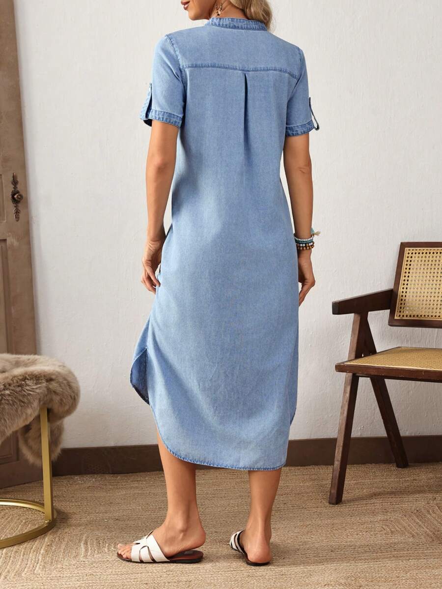 Composición: 75% Algodón, 19% Soft Poliéster (símil algodón), 6% Viscosa. Esta prenda tipo camisa con corte “A línea” y longitud midi combina comodidad y estilo en un diseño casual. Confeccionada en mezclilla no elástica, presenta talle alto, escote en V y un corte recto que favorece una caída natural. Incluye detalles funcionales como botones, bolsillos y delicadas aberturas laterales, aportando un aire relajado y versátil. Su color azul y las mangas cortas enrolladas realzan su carácter fresco y moderno. Es ideal para el uso diario y se puede lavar a máquina, evitando la limpieza en seco.