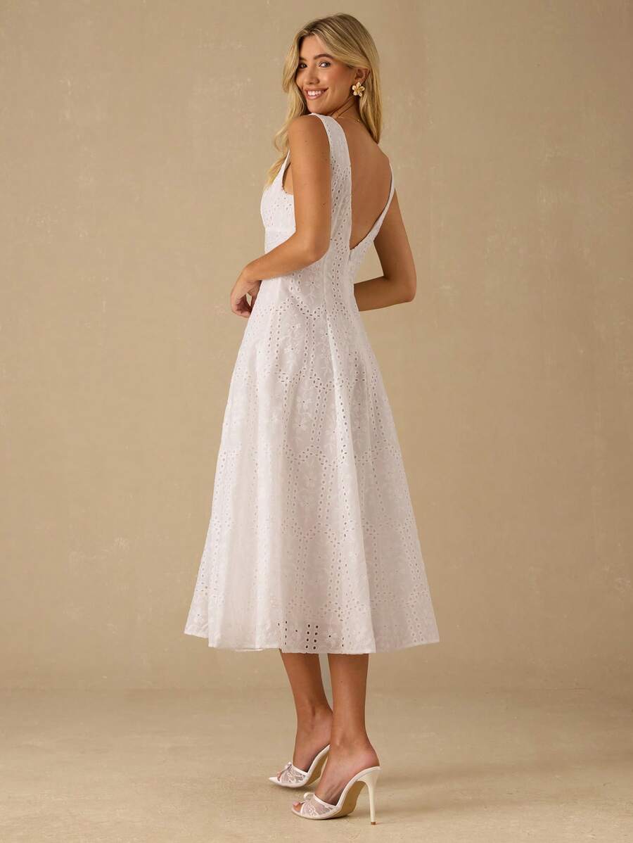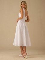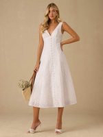 Composición: 100% Soft Poliéster (símil algodón). Este vestido midi tipo “A línea” combina elegancia y sencillez en una silueta refinada. Confeccionado en tela tejida no elástica y completamente forrado, ofrece una textura suave y una estructura impecable. Su talle alto y escote en “V” realzan la figura, mientras que el corte campana aporta movimiento y fluidez. De color blanco puro, destaca por detalles delicados como la espalda al aire, la cremallera oculta y el bordado de ojal que añaden un toque sofisticado. Su ajuste regular y diseño sin mangas lo hacen ideal para ocasiones especiales. Se recomienda lavar a mano y evitar la limpieza en seco.